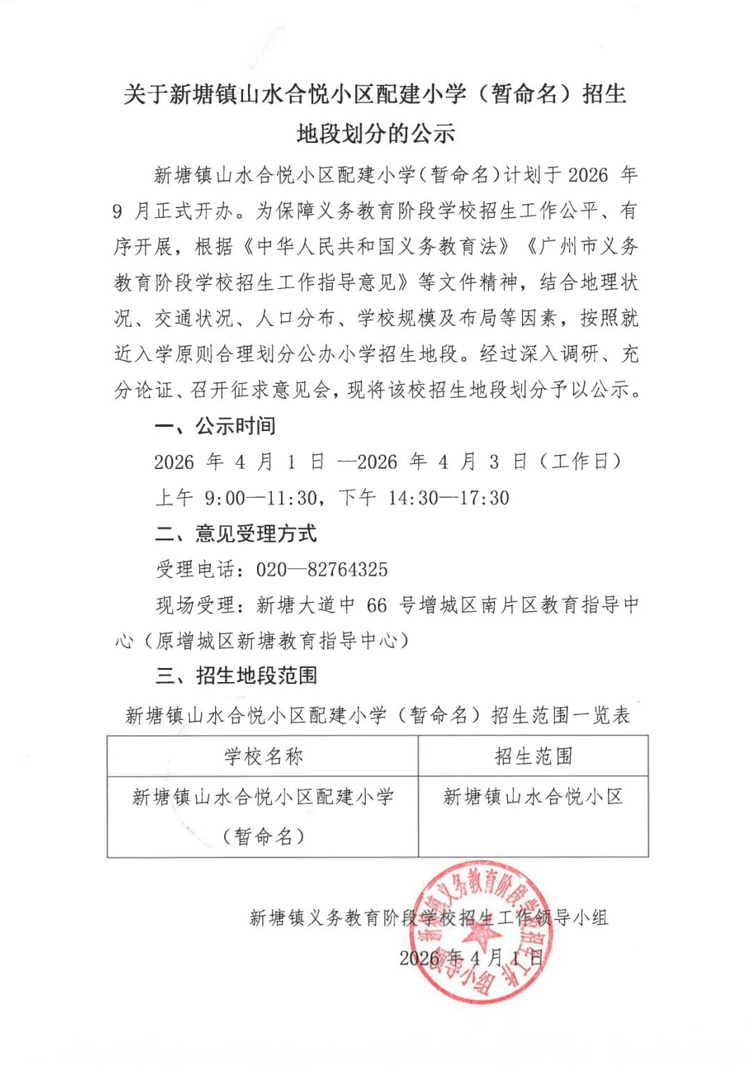 日前,新塘镇义务教育阶段学生招生工作领导小组发布《关于新塘镇山水合悦小区配建小学(暂命名)招生地段划分的公示》,明确该校9月正式开办,公示招生范围为新塘镇山水合悦小区。